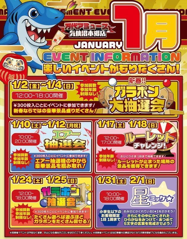 【1/2(金)~1/4(日)開催🎍】新春!!ガラポン大抽選会🎯 万代アミューズ気仙沼本郷店、新年最初の運試し!🐍 ⏰開催:12:00~18:00 300円投入ごとに参加可能! 参加回数・年齢制限なし! 新春ならではの豪華景品を盛りだくさんご用意しました!🎁✨ お正月は「けせんぬままんだい」へ集合!🚗💨 【1/10(土)~1/12(月祝)開催🌪️】エアー抽選会!✋ 3連休は気仙沼本郷店で熱くなれ!🔥 エアー抽選機の中から、舞うくじを掴み取ろう!✨ ⏰開催:10:00~20:00 300円投入ごとに参加OK! 年齢・回数制限はありません! 豪華景品をあなたの手でガッチリ掴んでください!✊🎁 ご来店をお待ちしております!😆 【1/17(土)・18(日)開催🎡】ルーレットチャレンジ!💫 今週末はドキドキのルーレット! 止まった場所の景品をゲットできるチャンス!🎁 ⏰開催:12:00~17:00 おひとり様1回まで挑戦できます! 参加年齢制限はなし! 狙いを定めて…ストップ!🛑 何が当たるかはお楽しみ!ぜひ遊びに来てくださいね!✨ 【1/24(土)・25(日)開催🎰】ガラポン抽選会!🔴🔵 1月最後の週末もイベント開催! 300円投入ごとにガラポンに挑戦できます!✨ ⏰開催:12:00~18:00 たくさん遊べば遊ぶほど、ガラポンがたくさん回せる!🌀 年齢・回数制限なし! 豪華景品を狙って回しまくろう!💪 皆様のご参加をお待ちしております!😊 【1/31(土)・2/1(日)開催🌟】星ミッケ☆探検隊!🔍 キッズ限定の楽しいイベント! お店に隠されている【★】を探そう!👀 ⏰開催:10:00~18:00 ★の中にある「ひらがな」を見つけて、5文字の言葉を完成させてね!✏️ 小学生以下のお客様限定、1日1回まで! 正解するといいことがあるかも…!? お店の中を探検だ!🏃♂️💨 2026年も万代アミューズ 気仙沼本郷店を宜しくお願い致します👐