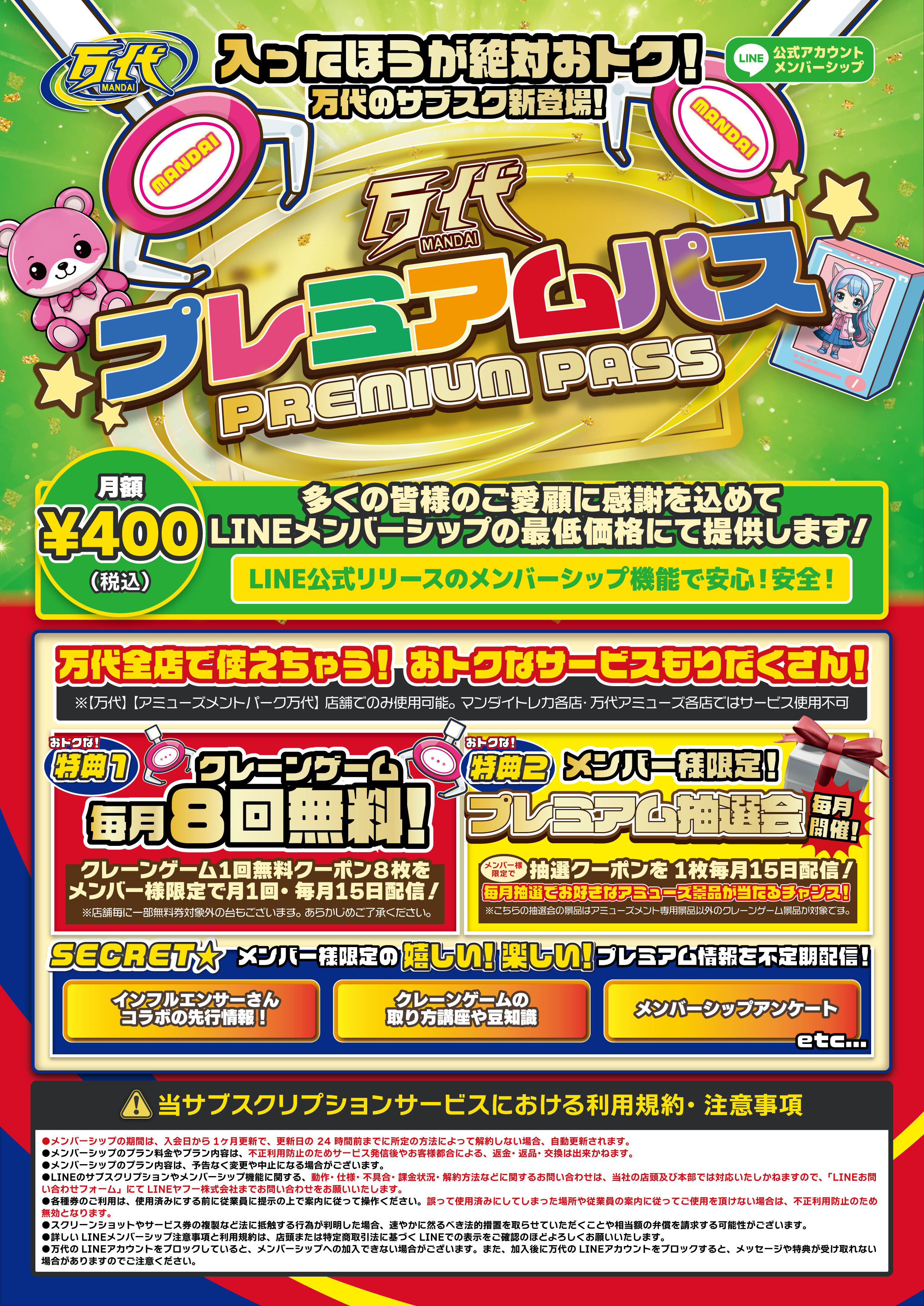 \登録者数1500名突破/ いつも万代をご利用いただき誠にありがとうございます✨ 皆様からのご要望にお応えしてゲームセンターのサブスク 🎊公式LINEメンバーシップを開設しました🎊 日頃UFOキャッチャーをご利用いただいている皆様が更にお安くプレイできるメンバーシップです🌟 お得な特典盛り沢山で感謝の気持ちを込めて 🔥LINE最低価格🔥でご提供 【詳細】 📅毎月15日📅は特典クーポン配信日 🎁クレーンゲーム無料券8回分 🎁限定プレミアム抽選会の抽選券 更に!メンバー限定お得情報も不定期配信予定👐 💡インフルエンサーコラボ先行情報 💡クレーンゲーム取り方講座や豆知識 💡メンバーシップアンケート などなど メンバーシップに加入して毎月メンバー限定のお得な特典をGET💪 是非お安くプレイ出来るこのチャンスをお見逃しなく📢 ⚠️各種券は、ご登録初回並びに 翌月以降も毎月1度15日に配信され、 使用期間は15日から翌月14日までとなりますのでご注意ください! 詳しくはこちら ⬇️⬇️⬇️⬇️⬇️⬇️⬇️⬇️