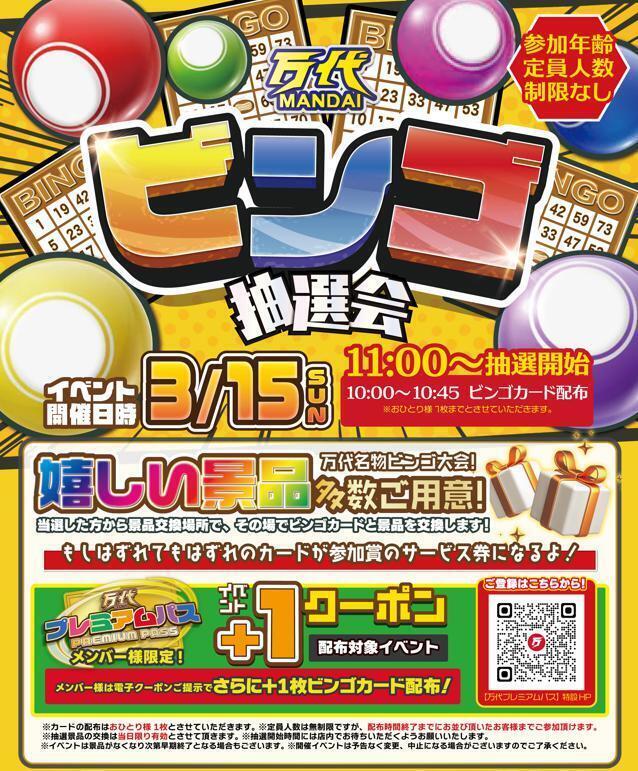 日曜日はみんな大好き、万代名物のビンゴ大会! 参加年齢・定員人数の制限なし!どなたでも参加可能です!🙆♀️✨ ⏰抽選開始:11:00~ (ビンゴカード配布 10:00~10:45) うれしい豪華景品が当たるチャンス!🎁 もしハズレても、ハズレたカードが参加賞の「サービス券」になるから絶対にお得!🉐 さらに!「万代プレミアムパス」会員様は… 電子クーポンご提示で「プラス1枚」ビンゴカードをプレゼントしちゃいます!📱✨ ご家族やお友達と一緒に、ビンゴを目指して盛り上がろう!🙌 ーーーーーー ☆万代とは☆ 「遊ぶ!買う!売る!嬉しい!楽しい!」をコンセプトにしたエンターテイメントリユースショップ!大型ゲームセンターを併設し、クレーンゲームやアミューズメントなど多彩なコンテンツをご提供。おもちゃ、トレーディングカード、ゲーム、古着などの買取サービスも充実。「アミューズメント」と「リサイクルショップ」を融合させた新しい体験をお子様、ご家族でぜひお楽しみください! ※店舗ごとに取扱商品が異なりますので各店舗にお問い合わせください。