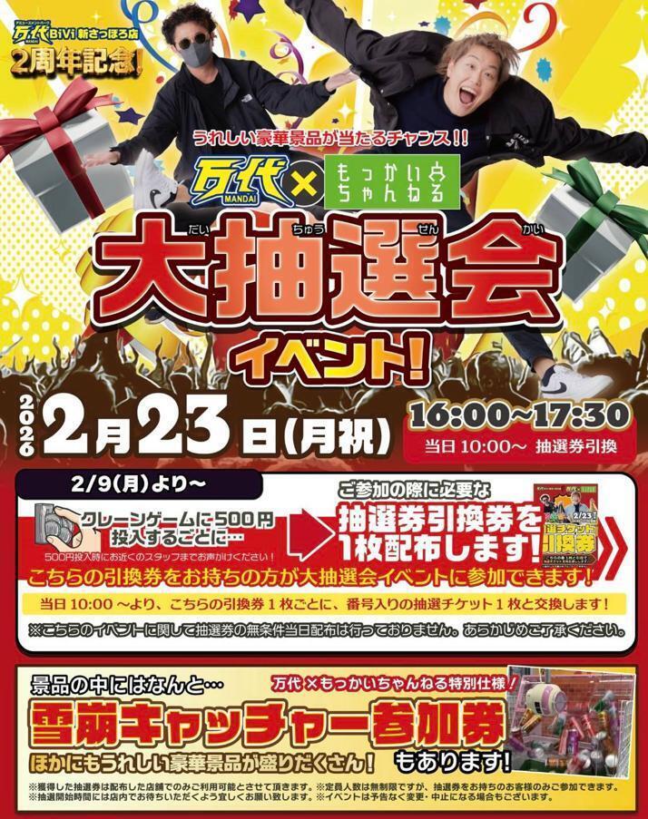 人気YouTuber「もっかいちゃんねる」コラボの大抽選会が開催されます! 目玉景品には、あの「雪崩キャッチャー参加券」も登場! 開催日:2026年2月23日(月・祝) 抽選会時間:16:00~17:30 ※BiVi新さっぽろ店は2周年記念イベントとなります! 📍 参加ルール 参加条件:2/9(月)より、クレーンゲームに500円投入ごとに配布される「抽選券引換券」が必要です。 ※当日の無条件配布は行っておりません。 当日の流れ: イベント当日の朝10:00より、お手元の「引換券」1枚ごとに「番号入り抽選チケット」1枚と交換いたします。 景品: 特別仕様の「雪崩キャッチャー参加券」や、その他うれしい景品が盛りだくさん!🎁 引換券を集めて、夢の「雪崩キャッチャー」挑戦権をゲットしよう!🔥 皆様のご参加をお待ちしております! ーーーーーー ☆万代とは☆ 「遊ぶ!買う!売る!嬉しい!楽しい!」をコンセプトにしたエンターテイメントリユースショップ!大型ゲームセンターを併設し、クレーンゲームやアミューズメントなど多彩なコンテンツをご提供。おもちゃ、トレーディングカード、ゲーム、古着などの買取サービスも充実。「アミューズメント」と「リサイクルショップ」を融合させた新しい体験をお子様、ご家族でぜひお楽しみください! ※店舗ごとに取扱商品が異なりますので各店舗にお問い合わせください。