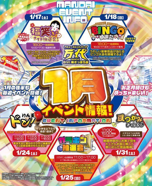 【1/17(土)夜開催🌝】 福笑いナイト抽選会!✨ 1月後半もBiVi新さっぽろ店はイベント満載! 土曜の夜は抽選会で運試ししませんか?🎯 ⏰抽選開始:18:00~ (抽選券引換 10:00~17:30) 当日10:00~17:00までにクレーンゲーム500円投入ごとに配布されるチケットで参加できます!🎫 遊べば遊ぶほど当選確率アップ!🔥 皆様のご参加をお待ちしております!😆 【1/18(日)開催🎯】 BINGO抽選会! 日曜の夕方はみんなでビンゴ大会! どなたでも参加可能です!🙆♀️✨ ⏰抽選開始:18:00~ (カード配布 16:00~17:30) うれしい豪華景品をご用意しました!🎁 お買い物や遊びの合間にぜひご参加ください! 家族みんなで盛り上がろう!🙌 【1/24(土)開催🔴】 けん玉「ドン!」 今週末はけん玉チャレンジ! 小学生以下限定イベントです!👦👧 ⏰開催時間:①11:00 ②13:00 ③15:00 (各回50分並び締め切り) 参加すると、なんと… 翌日の「ガラポン抽選会+1回参加券」がもらえるよ!🎫✨ 各回1回まで挑戦OK!集中してキメよう!💪 【1/25(日)開催🌀】 ガラポン抽選会! 1月最後の日曜日はガラポンを回そう! クレーンゲームで遊んで挑戦!🕹️ ⏰開催時間:11:00~17:00 (17時以降は会場撤去となります) 当日11:00~16:30までに、クレーンゲーム500円投入ごとに1回ガラポンに挑戦できます!🎫 豪華景品を狙って回しまくろう!😆 【1/31(土)開催🥢】 豆つかみチャレンジ! 1月の締めくくりはお箸使いがカギ!? 小学生以下限定のゲームイベント!🧒 ⏰開催時間:11:00~16:00 (15:45締め切り) 制限時間内にお箸を使って、豆をお皿に移そう!🥢 移せた数に応じて景品をゲットできるよ!🎁 お箸名人は誰だ!?挑戦待ってるよ!🔥 ーーーーーー ☆アミューズメントパーク万代とは☆ 「遊ぶ!嬉しい!楽しい!」をコンセプトにしたクレーンゲーム専門店! 万代 BiVi新さっぽろ店はクレーンゲーム専門店にリニューアル!新さっぽろ地区地域最大級のゲームセンターです☆「家族の絆を育む遊び場」の需要拡大を背景に、地域に根ざした新しいエンターテインメント空間を創出します。大型キッズスペースや「10 円キャッチャー」や「SNSで話題の台湾キャッチャー」も完備し、ヤングファミリー層に新しい”遊び場”を提供します。新しい体験をお子様、ご家族でぜひお楽しみください!