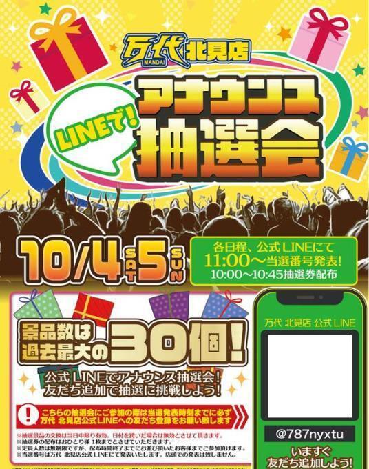 今週末の10月4日(土)・5日(日)は、万代 北見店にて 「LINEで!アナウンス抽選会」を開催! 景品数はなんと過去最大の30個をご用意しました!🎁 ご参加には、万代 北見店の 【LINE公式アカウントへの友だち登録が必須】です! 参加方法 ① まずはLINEで友だち追加! ② 今週末、お店で抽選券をゲット!(配布は10:00~10:45) ③ 11時にLINEで当選発表をチェック! 今のうちに友だち登録を済ませて、週末は豪華景品を狙いに万代 北見店へお越しください! ーーーーーー ☆万代とは☆ 「遊ぶ!買う!売る!嬉しい!楽しい!」をコンセプトにしたエンターテイメントリユースショップ!大型ゲームセンターを併設し、クレーンゲームやアミューズメントなど多彩なコンテンツをご提供。おもちゃ、トレーディングカード、ゲーム、古着などの買取サービスも充実。「アミューズメント」と「リサイクルショップ」を融合させた新しい体験をお子様、ご家族でぜひお楽しみください! ※店舗ごとに取扱商品が異なりますので各店舗にお問い合わせください。