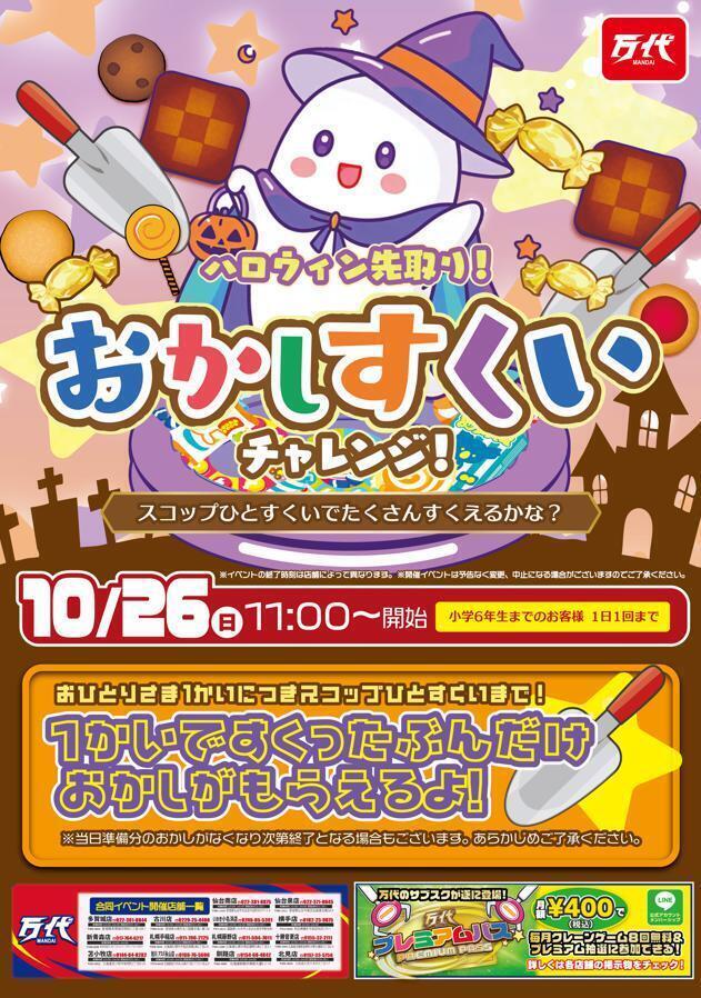 今週末の日曜日、10月26日はお子様必見! 11時から「おかしすくいチャレンジ」を開催します! (※小学生以下のお子様限定です) スコップひとすくいでお菓子がもらえる、夢のようなイベントです! どれだけたくさんすくえるか、ぜひ挑戦してみてくださいね💪 週末は万代 北見店で、ハロウィン気分を先取りしちゃいましょう! ご家族皆様でのご来店をお待ちしております! ーーーーーー ☆万代とは☆ 「遊ぶ!買う!売る!嬉しい!楽しい!」をコンセプトにしたエンターテイメントリユースショップ!大型ゲームセンターを併設し、クレーンゲームやアミューズメントなど多彩なコンテンツをご提供。おもちゃ、トレーディングカード、ゲーム、古着などの買取サービスも充実。「アミューズメント」と「リサイクルショップ」を融合させた新しい体験をお子様、ご家族でぜひお楽しみください! ※店舗ごとに取扱商品が異なりますので各店舗にお問い合わせください。