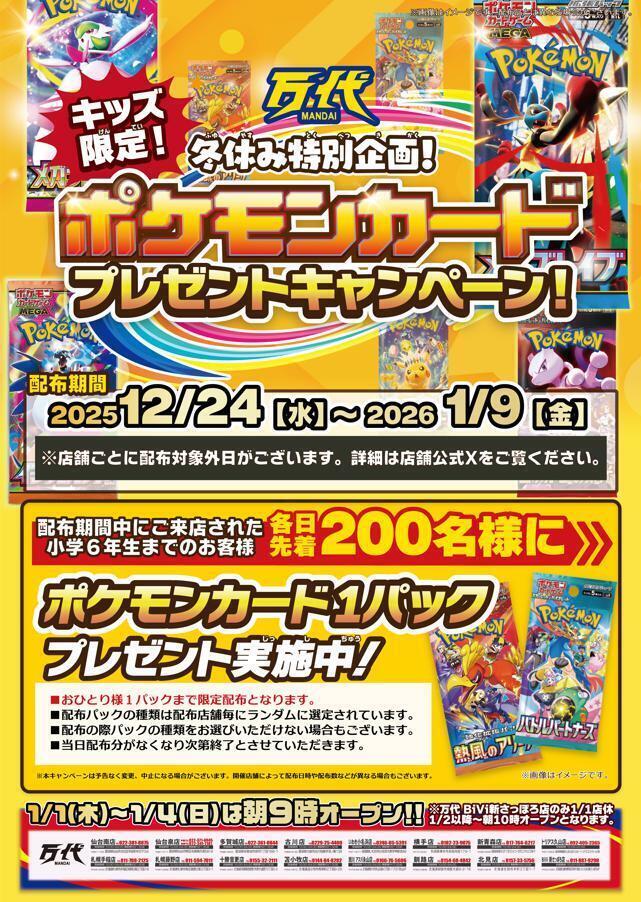 【明日12/24(水)~】 キッズ限定!ポケカプレゼント🎁 冬休み特別企画! 小学生以下のお客様限定で、ご来店された各日先着200名様に『ポケモンカード1パック』をプレゼントします! 📅配布期間:12/24(水)~1/9(金) 毎日もらえるチャンス! 冬休みは万代 北見店へ遊びに来てね! ※店舗により配布除外日がございます。詳細は公式SNSをご確認ください。 ーーーーーー ☆万代とは☆ 「遊ぶ!買う!売る!嬉しい!楽しい!」をコンセプトにしたエンターテイメントリユースショップ!大型ゲームセンターを併設し、クレーンゲームやアミューズメントなど多彩なコンテンツをご提供。おもちゃ、トレーディングカード、ゲーム、古着などの買取サービスも充実。「アミューズメント」と「リサイクルショップ」を融合させた新しい体験をお子様、ご家族でぜひお楽しみください! ※店舗ごとに取扱商品が異なりますので各店舗にお問い合わせください。