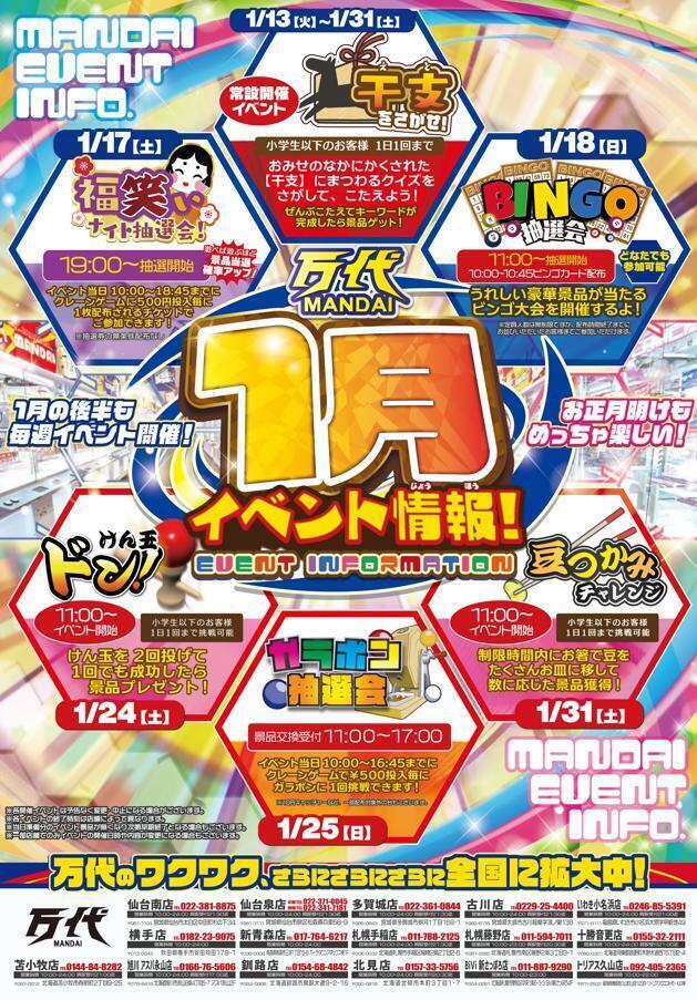 週末は万代 北見店で遊びつくそう! 【1/13(火)~31(土)開催🐎】 干支をさがせ!🔍 お店の中に隠された「干支」にまつわるクイズを探そう! 全部答えてキーワードが完成したら景品ゲット!🎁 対象:小学生以下のお客様 制限:1日1回まで 2026年の干支は何かな?🤔 お店の中を探検して、クイズに挑戦してね!🏃♂️💨 【1/17(土)夜開催🌝】 福笑いナイト抽選会!✨ 土曜の夜は抽選会で盛り上がろう! 豪華景品が当たるチャンス!🎁 ⏰抽選開始:19:00~ (参加券配布 10:00~18:45) クレーンゲーム500円投入ごとに参加チケットを1枚配布!🎫 遊べば遊ぶほど当選確率アップ!🔥 たくさんのご参加をお待ちしております!😆 【1/18(日)開催🎯】 BINGO抽選会! 日曜日はみんな大好きビンゴ大会! どなたでも参加可能です!🙆♀️✨ ⏰抽選開始:11:00~ (カード配布 10:00~10:45) うれしい豪華景品をご用意しました!🎁 ご家族やお友達と一緒に、ビンゴを目指して盛り上がろう!🙌 【1/24(土)開催🔴】 けん玉「ドン!」チャレンジ 今週末は日本の伝統遊びで勝負! 小学生以下のお子様限定イベントです!👦👧 ⏰開始時間:11:00~ けん玉を2回投げて、1回でもお皿に乗れば成功!✨ 見事成功したら景品をプレゼント!🎁 1日1回挑戦できます!集中して…エイッ!💪 【1/25(日)開催🌀】 ガラポン抽選会! 1月最後の日曜日はガラポンで運試し! クレーンゲームで遊んで挑戦しよう!🕹️ ⏰景品交換:11:00~17:00 当日10:00~16:45までに、クレーンゲーム500円投入ごとに1回ガラポンを回せます!🎫 何色の玉が出るかな!? 豪華景品を狙って回しまくろう!😆 【1/31(土)開催🥢】 豆つかみチャレンジ! 1月の締めくくりはお箸の使い方がカギ!? 小学生以下限定のゲームイベント!🧒 ⏰開始時間:11:00~ 制限時間内にお箸を使って、豆をたくさんお皿に移そう!⏱️ 移せた数に応じて景品を獲得できるよ!🎁 お箸名人は誰だ!?挑戦待ってるよ!🔥 ーーーーーー ☆万代とは☆ 「遊ぶ!買う!売る!嬉しい!楽しい!」をコンセプトにしたエンターテイメントリユースショップ!大型ゲームセンターを併設し、クレーンゲームやアミューズメントなど多彩なコンテンツをご提供。おもちゃ、トレーディングカード、ゲーム、古着などの買取サービスも充実。「アミューズメント」と「リサイクルショップ」を融合させた新しい体験をお子様、ご家族でぜひお楽しみください! ※店舗ごとに取扱商品が異なりますので各店舗にお問い合わせください。