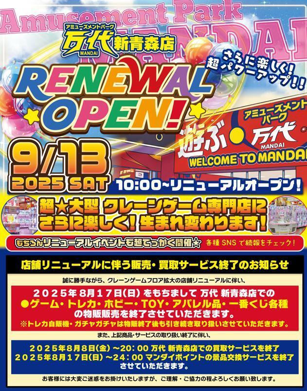 万代新青森店が、9月13日(土)朝10時にリニューアルオープンします!✨ 今度はなんと…【超大型クレーンゲーム専門店】に大変身!💪🎈 最新の景品がいっぱいの、家族みんなで楽しめるドキドキわくわくの空間になりますよ👨👩👧👦 新しくなった万代に、ぜひ遊びに来てくださいね!😊 スタッフ一同、心よりお待ちしております。 【大切なお知らせ】 リニューアルに伴い、8月17日(日)をもちまして、ゲーム・古着等の物販、およびポイント交換サービスを終了させていただきます。 ご不明点は店舗にお問い合わせください。 長らくのご愛顧、誠にありがとうございました。 ーーーーーー ☆万代とは☆ 「遊ぶ!買う!売る!嬉しい!楽しい!」をコンセプトにしたエンターテイメントリユースショップ!大型ゲームセンターを併設し、クレーンゲームやアミューズメントなど多彩なコンテンツをご提供。おもちゃ、トレーディングカード、ゲーム、古着などの買取サービスも充実。「アミューズメント」と「リサイクルショップ」を融合させた新しい体験をお子様、ご家族でぜひお楽しみください! ※店舗ごとに取扱商品が異なりますので各店舗にお問い合わせください。