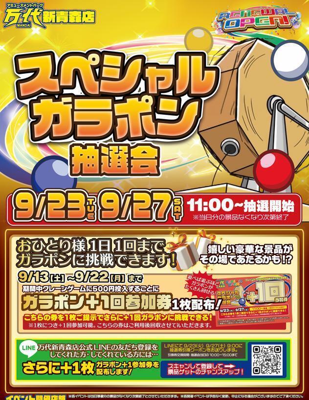 万代 新青森店からのお知らせです! リニューアルを記念して、スペシャルなガラポン抽選会を開催します! 開催日:9月27日(土) ただいま、クレーンゲームに500円投入で、ガラポンがプラス1回できる参加券を配布中! 今週末のうちに参加券をゲットしてイベントに備えましょう!皆様のご来店をお待ちしております!🥳 ーーーーーー ☆万代とは☆ 「遊ぶ!買う!売る!嬉しい!楽しい!」をコンセプトにしたエンターテイメントリユースショップ!大型ゲームセンターを併設し、クレーンゲームやアミューズメントなど多彩なコンテンツをご提供。おもちゃ、トレーディングカード、ゲーム、古着などの買取サービスも充実。「アミューズメント」と「リサイクルショップ」を融合させた新しい体験をお子様、ご家族でぜひお楽しみください! ※店舗ごとに取扱商品が異なりますので各店舗にお問い合わせください。