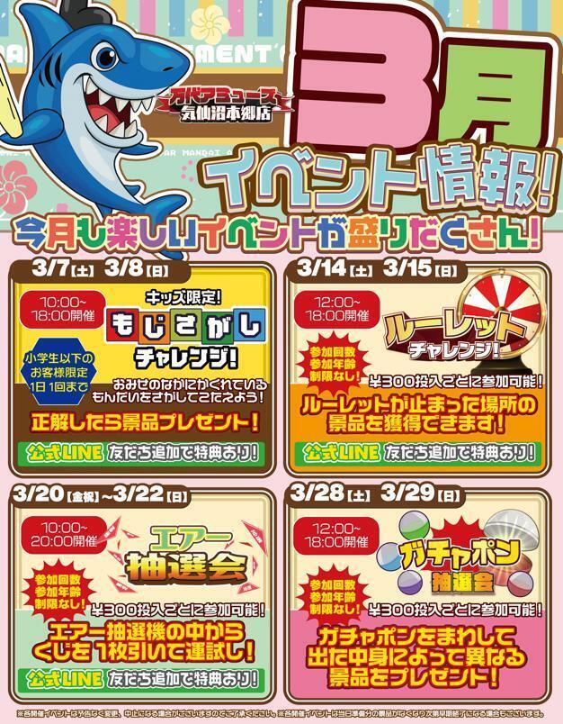 気仙沼本郷店では、今月も毎週末楽しいイベントが盛りだくさん!✨ 公式LINEを友だち追加しておくと、各イベントで嬉しい特典がありますよ!📱🉐 1. もじさがしチャレンジ! 【3/7(土)・8(日)開催🔍】もじさがしチャレンジ! お店に隠れている問題を探して答えよう!正解したら景品プレゼント!🎁 ⏰開催:10:00~18:00 👦対象:小学生以下のお客様限定(1日1回まで) 2. ルーレットチャレンジ! 【3/14(土)・15(日)開催🎡】ルーレットチャレンジ! ルーレットを回して、止まった場所の景品をゲットしよう!✨ ⏰開催:12:00~18:00 🎟️条件:300円投入ごとに参加可能(参加回数・年齢制限なし!) 3. エアー抽選会 【3/20(金祝)~22(日)開催🌪️】エアー抽選会! 3連休はエアー抽選機の中からくじを1枚引いて運試し!😆 ⏰開催:10:00~20:00 🎟️条件:300円投入ごとに参加可能(参加回数・年齢制限なし!) 4. ガチャポン抽選会 【3/28(土)・29(日)開催💊】ガチャポン抽選会! ガチャポンを回して、出た中身によって違う景品をプレゼント!🎁 ⏰開催:12:00~18:00 🎟️条件:300円投入ごとに参加可能(参加回数・年齢制限なし!)