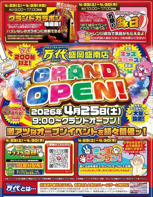 大人気のクレーンゲーム専門店「アミューズメントパーク万代 盛岡盛南店」が、ついにグランドオープンいたします!✨ ご家族みんなで遊びやすい、超大型エンターテイメントアミューズメントパークです!😆 💡 盛岡盛南店のココがすごい! 🕹️ クレーンゲームは200台以上! 🪙10円から遊べる!ロープライス台も大量設置でお財布に優しい! 🧸 大型キッズスペース完備!小さなお子様連れでも安心して遊べます! 💊 ガチャ・カプセルトイ大量設置! 🔥 激アツなオープンイベントを続々開催ッ! 🔥 ✅ 超でっかい!グランドガラポン抽選会 ⏰4/25(土)~4/29(水祝) 各日9:00~17:00開催 クレーンゲームに500円投入ごとに配布される参加券をご提示で、ハズレなしのガラポンに挑戦できます! ※参加券は各日1500枚限定(なくなり次第終了)。500円投入前にスタッフをお呼びください! ✅ グランドオープン お祭り縁日 ⏰4/25(土)~4/30(木) 各日10:00~17:00開催 クレーンゲームに500円投入ごとに「縁日券」を1枚配布!1枚で好きな縁日イベントを1つ選んで遊べます。チャレンジ成功で景品ゲット! ※500円投入前にスタッフをお呼びください! ✅ きっずジャンケン! ⏰4/25(土)~4/30(木) 👦小学6年生までのお子様限定(おひとりさま1日1回まで) 着ぐるみを着たスタッフがランダムで出現!じゃんけんをして勝ったらごほうびがもらえるよ!✌️ ✅ 万代プレミアムパス サブスク登録イベント ⏰4/25(土)~4/30(木) 月額400円のおトクなサブスク「万代プレミアムパス」に初回登録すると、当日から使える「クレーンゲーム1回無料クーポン」をなんと8回分も配布!📱🉐 公式X(旧Twitter)、Instagram、LINEもぜひフォロー&友だち登録をお願いします! オープン日は皆様お誘い合わせの上、万代 盛岡盛南店へ大集合!🚗💨 スタッフ一同、心よりお待ちしております! ーーーーーー ☆万代とは☆ 「遊ぶ!買う!売る!嬉しい!楽しい!」をコンセプトにしたエンターテイメントリユースショップ!大型ゲームセンターを併設し、クレーンゲームやアミューズメントなど多彩なコンテンツをご提供。おもちゃ、トレーディングカード、ゲーム、古着などの買取サービスも充実。「アミューズメント」と「リサイクルショップ」を融合させた新しい体験をお子様、ご家族でぜひお楽しみください! ※店舗ごとに取扱商品が異なりますので各店舗にお問い合わせください。
