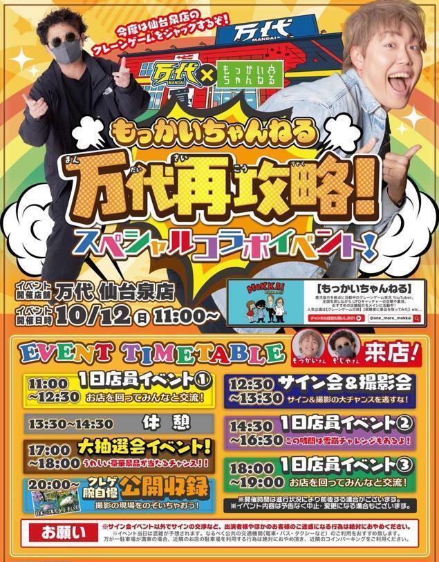 万代 仙台泉店からスペシャルなお知らせです! 来週末の10月12日(日)に、大人気YouTuberの『もっかいちゃんねる』さんが来店!一日店長としてお店を盛り上げてくれます!✨ 当日はサイン会&撮影会、豪華景品が当たる大抽選会、さらにはクレーンゲーム腕自慢の公開収録まで、内容盛りだくさんの一日です!🎥 ファンの方はもちろん、地域の皆様も楽しめること間違いなし! 来週末はぜひ、万代 仙台泉店へお越しください!😊 ーーーーーー ☆万代とは☆ 「遊ぶ!買う!売る!嬉しい!楽しい!」をコンセプトにしたエンターテイメントリユースショップ!大型ゲームセンターを併設し、クレーンゲームやアミューズメントなど多彩なコンテンツをご提供。おもちゃ、トレーディングカード、ゲーム、古着などの買取サービスも充実。「アミューズメント」と「リサイクルショップ」を融合させた新しい体験をお子様、ご家族でぜひお楽しみください! ※店舗ごとに取扱商品が異なりますので各店舗にお問い合わせください。