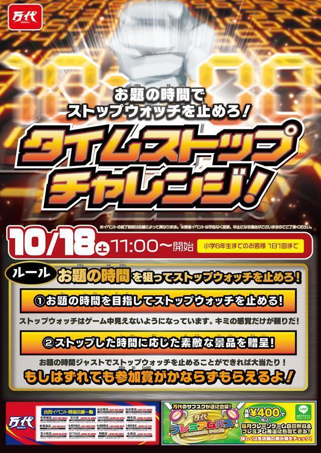 今週末の土曜日、10月18日は「タイムストップチャレンジ」を開催! (※小学生以下のお子様限定です) お題の時間ぴったりをねらって、ストップウォッチを止めるドキドキのゲームです! 見えない時計を止めるのは、まさにキミの感覚だけが頼り…! お題の時間ジャストで止められたら大当たり!🎉 もしハズレても参加賞がもらえるから、ぜひ気軽に挑戦しにきてくださいね! ーーーーーー ☆万代とは☆ 「遊ぶ!買う!売る!嬉しい!楽しい!」をコンセプトにしたエンターテイメントリユースショップ!大型ゲームセンターを併設し、クレーンゲームやアミューズメントなど多彩なコンテンツをご提供。おもちゃ、トレーディングカード、ゲーム、古着などの買取サービスも充実。「アミューズメント」と「リサイクルショップ」を融合させた新しい体験をお子様、ご家族でぜひお楽しみください! ※店舗ごとに取扱商品が異なりますので各店舗にお問い合わせください。