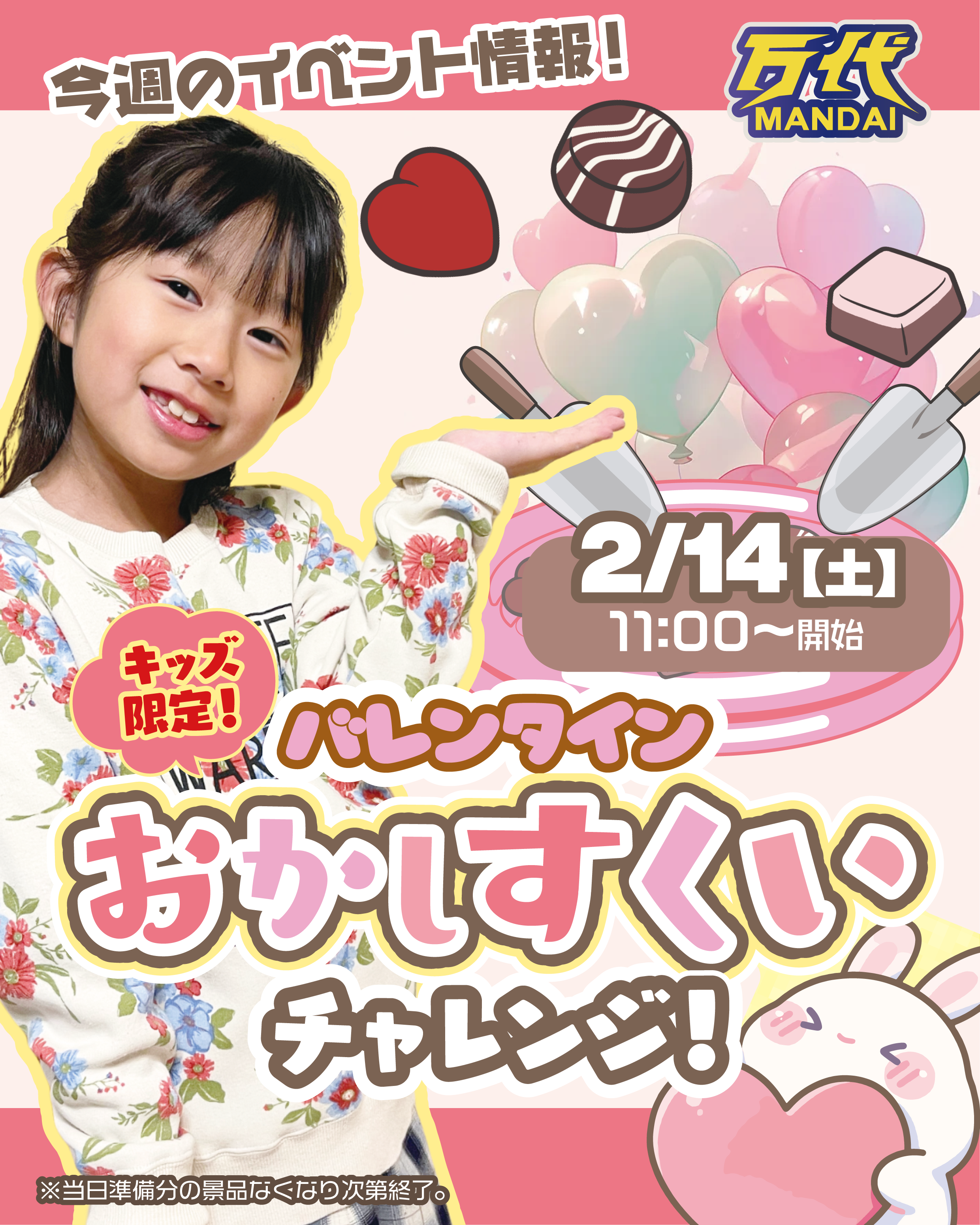 ハッピーバレンタイン!💕 今週の土曜日は、あま~いイベントを開催! 小学生以下のお客様限定です!👦👧 ⏰開始時間:11:00~ (お菓子がなくなり次第終了) スコップ「ひとすくい」で、すくった分だけバレンタインチョコがもらえるよ!✨ おひとり様1回勝負! たくさんすくってね! ご参加お待ちしております!😋 ーーーーーー ☆万代とは☆ 「遊ぶ!買う!売る!嬉しい!楽しい!」をコンセプトにしたエンターテイメントリユースショップ!大型ゲームセンターを併設し、クレーンゲームやアミューズメントなど多彩なコンテンツをご提供。おもちゃ、トレーディングカード、ゲーム、古着などの買取サービスも充実。「アミューズメント」と「リサイクルショップ」を融合させた新しい体験をお子様、ご家族でぜひお楽しみください! ※店舗ごとに取扱商品が異なりますので各店舗にお問い合わせください。