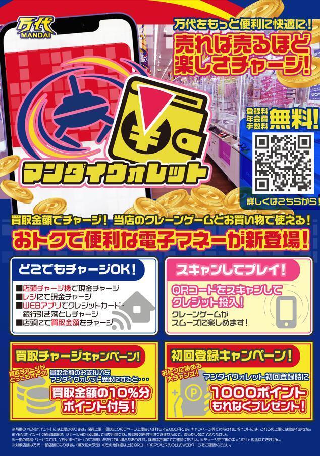 万代をもっと便利に、快適に! 当店のクレーンゲームやお買い物で使える、新しい電子マネー「マンダイウォレット」が誕生しました!🎉 登録料・年会費・手数料はすべて無料です!🆓 💡 マンダイウォレットのここが便利! ✅ どこでもチャージOK! 店頭のチャージ機やレジでの現金チャージはもちろん、WEBアプリからのクレジットカード・銀行引き落としにも対応! さらに、店頭での「買取金額」をそのままチャージすることも可能です!♻️ ✅ スキャンしてスムーズにプレイ! クレーンゲーム機にあるQRコードをスマホでスキャンするだけで、サクッとクレジット投入完了!小銭いらずでスムーズに遊べます!🕹️📱 🔥 絶対見逃せない!超おトクなWキャンペーン実施中! 🎁 その1:初回登録キャンペーン! 今なら、マンダイウォレットに初回登録するだけで【もれなく1000ポイント】をプレゼント!おトクに始める大チャンスです!✨ 🎁 その2:買取チャージキャンペーン! お店で品物を売った際、買取代金のお支払いを「マンダイウォレット受取」にすると… なんと【買取金額の10%分】のポイントを上乗せして付与しちゃいます!売れば売るほど楽しさがチャージされますよ!💰📈 ご登録は店頭のポスターのQRコード、または公式WEBページから! 万代での遊びとお買い物がもっと楽しくなる「マンダイウォレット」を、ぜひこの機会にご利用ください!😆🚗💨 ※YEN(ポイント)の有効期限はチャージ日から起算して6ヶ月間です。 ※対象店舗は万代一部店舗(順次拡大予定)となります。 ーーーーーー ☆万代とは☆ 「遊ぶ!買う!売る!嬉しい!楽しい!」をコンセプトにしたエンターテイメントリユースショップ!大型ゲームセンターを併設し、クレーンゲームやアミューズメントなど多彩なコンテンツをご提供。おもちゃ、トレーディングカード、ゲーム、古着などの買取サービスも充実。「アミューズメント」と「リサイクルショップ」を融合させた新しい体験をお子様、ご家族でぜひお楽しみください! ※店舗ごとに取扱商品が異なりますので各店舗にお問い合わせください。